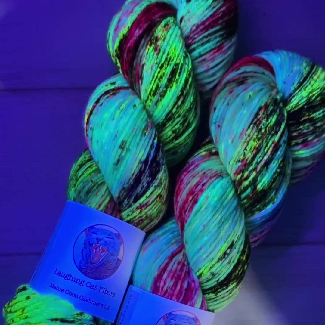 This updated version is infused with UV-reactive neon blue dyes and layered wet speckling, creating a sense of motion and atmospheric light that shifts across the skein. Teal and electric blue tones flow and flicker throughout, echoing the natural phenomenon that inspired its name — luminous, dynamic, and quietly powerful.