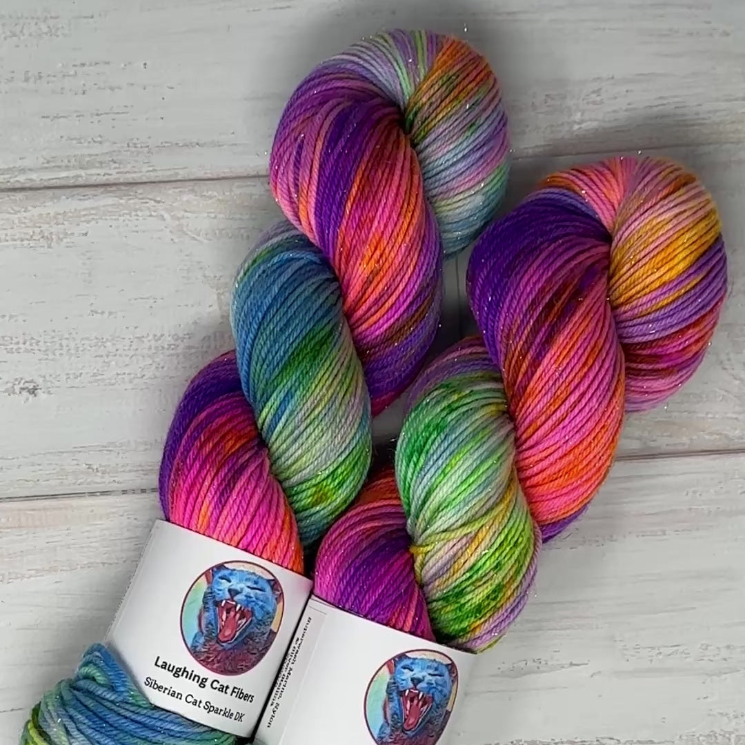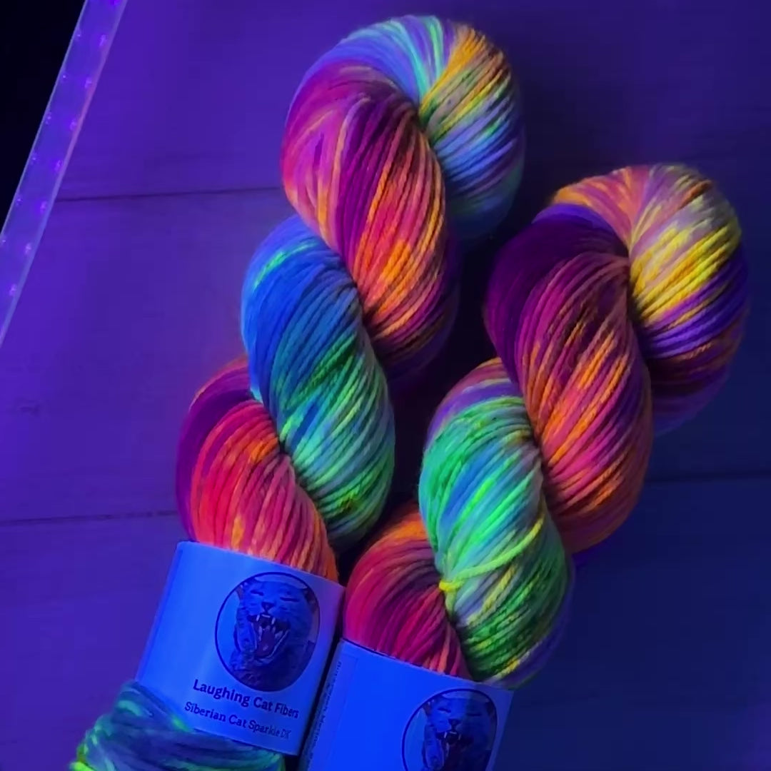 This colorway blends luminous brights with darker cosmic tones, creating a playful yet expansive palette that feels both energetic and atmospheric. Layered dye work allows color to shift and interact across the skein, rewarding texture and stitch definition as fabric grows.