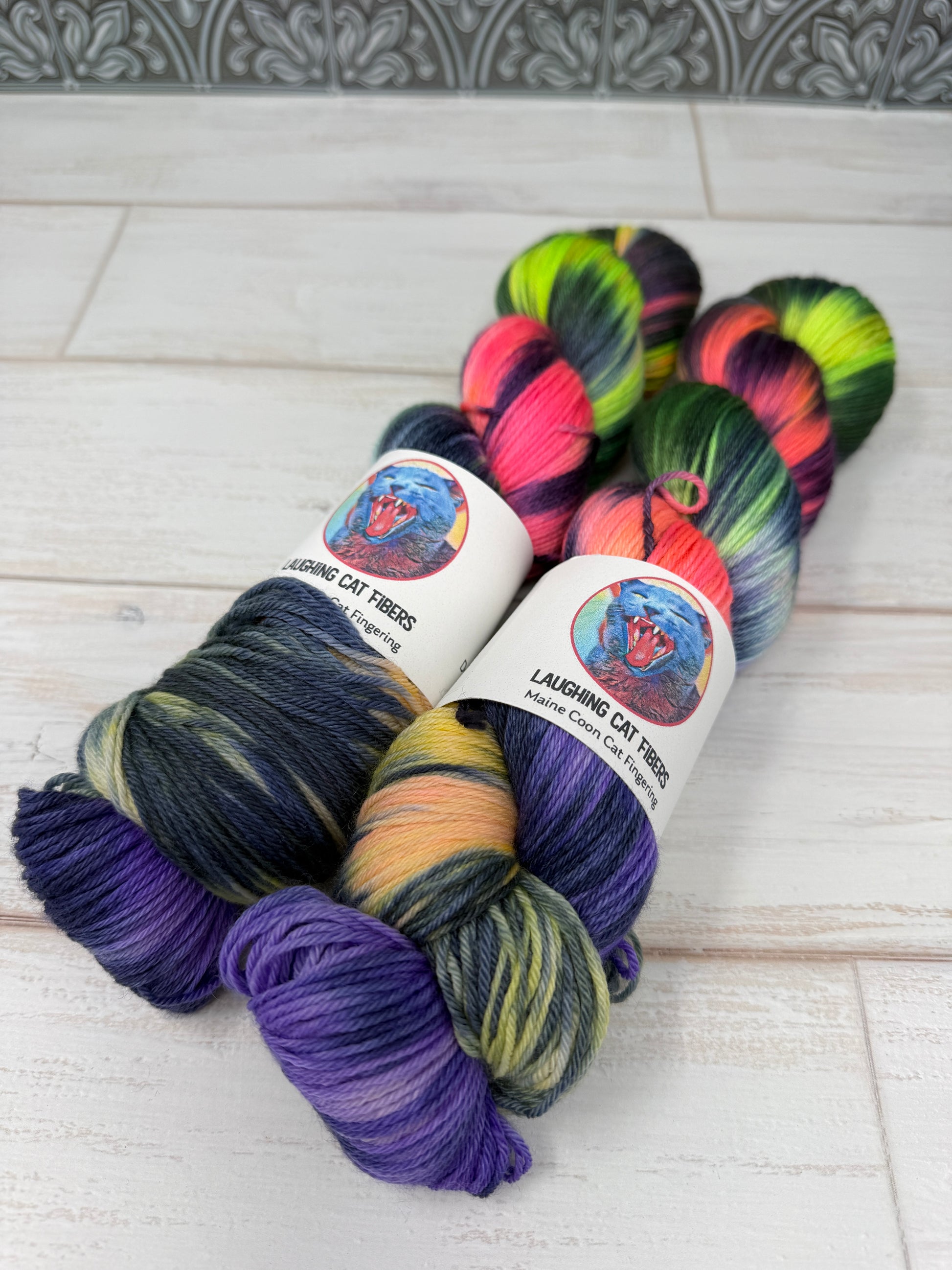 Expect swirls of stellar teal, ultraviolet greens, hot neons, cosmic berry purples, infrared reds, and that unmistakable Laughing Cat flair.