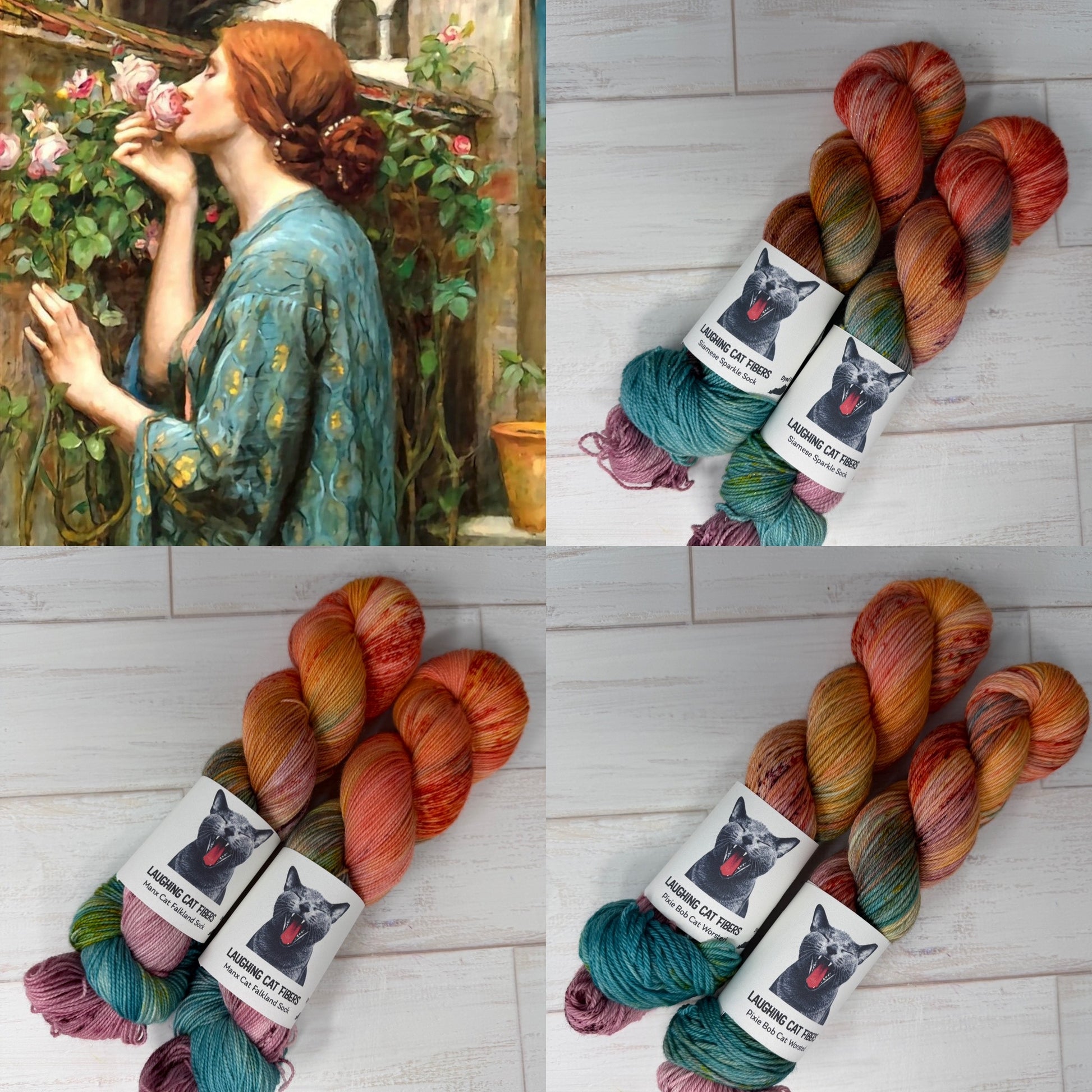 Inspired by the romantic imagery of John William Waterhouse, The Soul of the Rose translates painterly intimacy, texture, and emotional softness into fiber. This colorway draws directly from the layered tones of the kimono, the warmth of flushed skin, the cool restraint of teal shadows, and the quiet luminosity woven throughout the original painting.