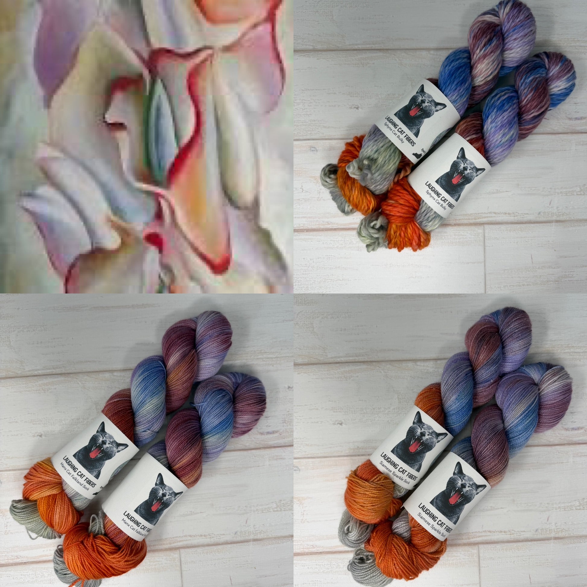 That sense of movement carries into the yarn. Dusty lavender, muted plum, and soft periwinkle drift across the skein, grounded by warm terracotta, clay, and subtle gray undertones. The palette shifts organically from cool to warm, echoing the way O’Keeffe’s petals blur edges and blend color into something both delicate and dynamic.